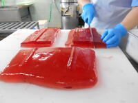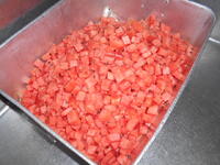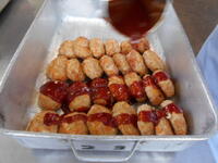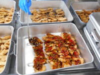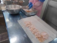 ↓「ハニーマスタードチキン」のとり肉を鉄板に並べています