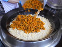 ↓ちゃんこ鍋風煮こみに入っていた肉だんごを手作業で1つずつ丸めて釜に入れています