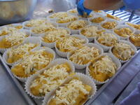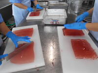 ↓マヨネーズソースとチーズを手作業でかつおの上にのせます