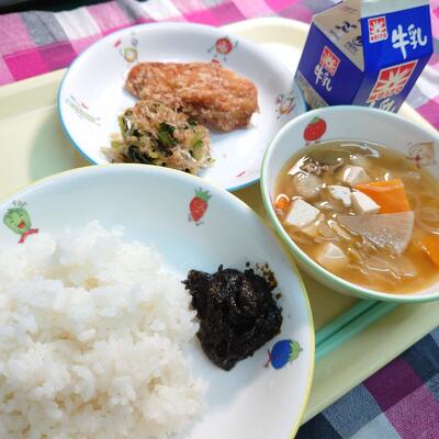 ごはん キャベツメンチ おかかあえ わかめスープ 牛乳
