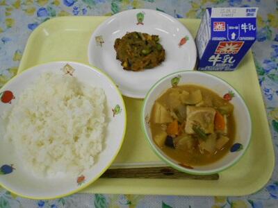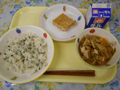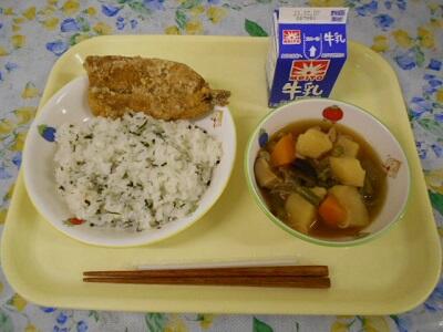 わかめごはん、イワシのカレー竜田揚げ、肉じゃが、牛乳