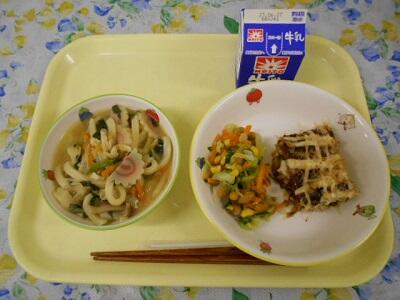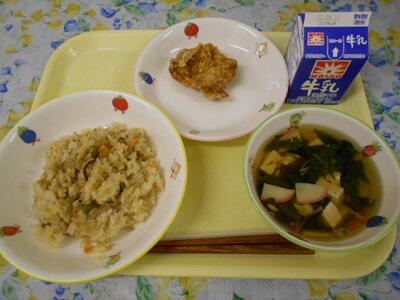 五目ごはん、鶏のから揚げ、すまし汁、牛乳