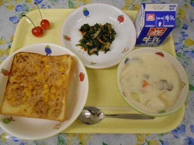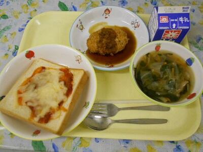 ピザトースト、手作りコロッケ、野菜スープ、牛乳