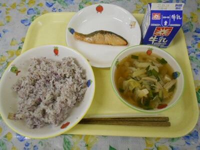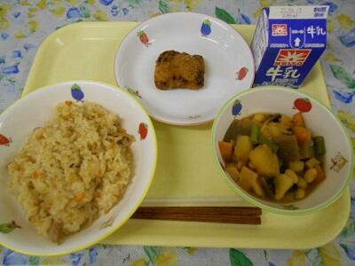 五目ごはん、赤魚の西京焼き、にら玉汁、牛乳