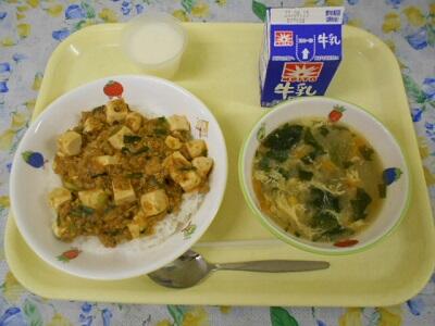 マーボー丼、中華風コーンスープ、カルピスゼリー、牛乳