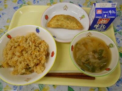 チャーハン、蒸しシューマイ、中華スープ、牛乳
