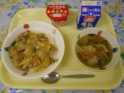豚丼、かき玉汁、ヨーグルト、牛乳