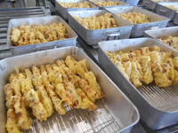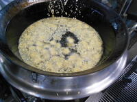 ↓揚げ終わったら食缶にちくわとさつまいもを入れます