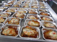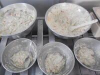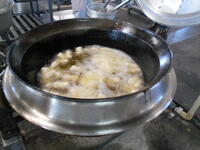 ↓煮込み終わったサバを釜から取り出して各クラスの食缶に入れます