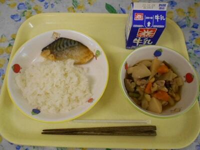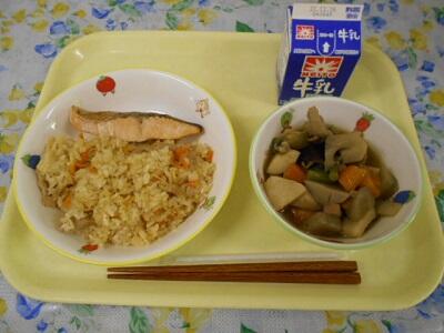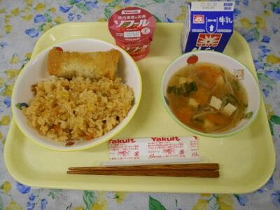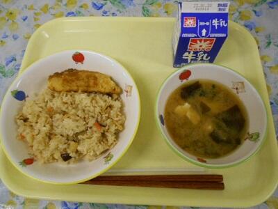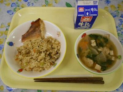 切干大根ごはん、タラの竜田揚げ、味噌汁、牛乳