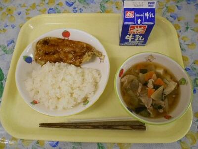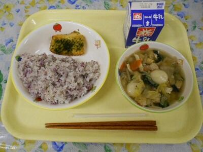 ごはん、イカの磯焼き、きんぴらサラダ、白玉汁、牛乳