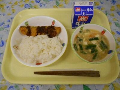 わかめごはん、イワシのカレー竜田揚げ、肉じゃが、牛乳