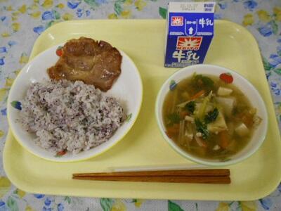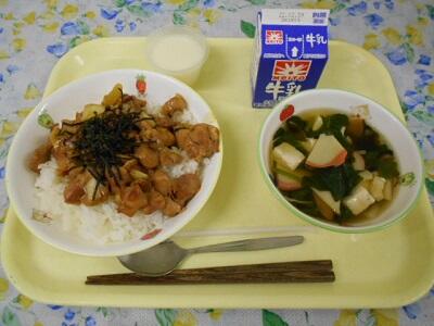 ごはん、鶏肉の照焼き、野菜チップス、かき玉汁、牛乳