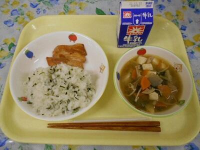 ゆかりごはん、鶏肉の香味焼き、豚汁、牛乳