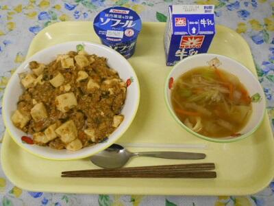 マーボー丼、わかめスープ、杏仁ゼリー、牛乳