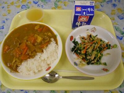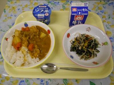 カレーライス、豆サラダ、ぶどうゼリー、牛乳