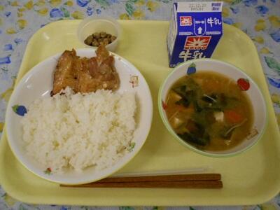 ごはん、鶏肉の唐揚げ、納豆和え、大根の味噌汁、牛乳