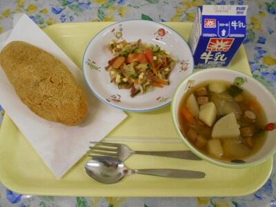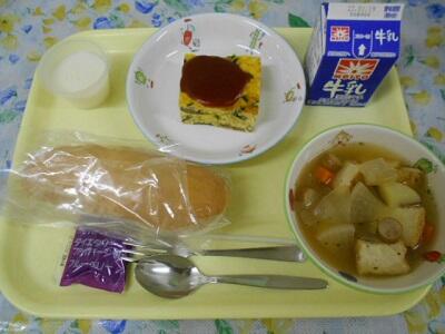 コッペパン、いちごジャム、いもミートグラタン、野菜スープ、牛乳