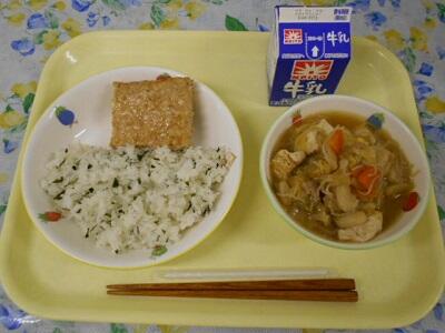 ゆかりごはん、鶏肉の唐揚げ、和風サラダ、生揚げの肉味噌煮、牛乳