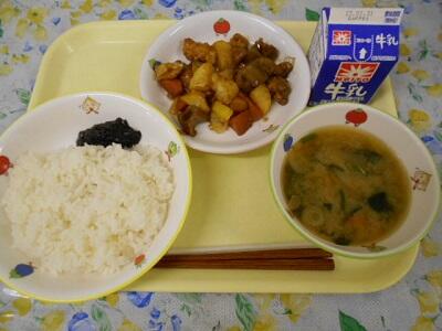 ごはん、酢豚、中華スープ、りんごゼリー、牛乳
