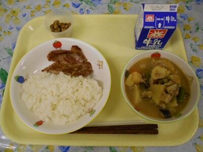 ごはん、焼肉、生揚げの肉味噌煮、黒糖大豆、牛乳