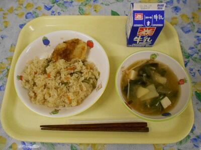 五目ごはん、タラのねぎソースがけ、味噌汁、牛乳
