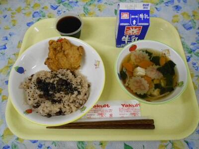 赤飯、鶏のから揚げ、お祝い汁、ぶどうゼリー、牛乳