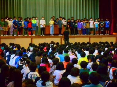 運動会の歌の歌詞を変えて全校で応援歌を歌いました。