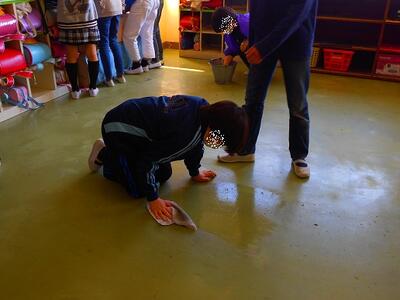 10:20、教頭先生の放送で「訓練地震」が発生したことが伝えられると、みんな頭を隠すように小さくなったり机の下にもぐったり、校庭にいた児童は真ん中に集まって物が倒れてこないか見守りました。