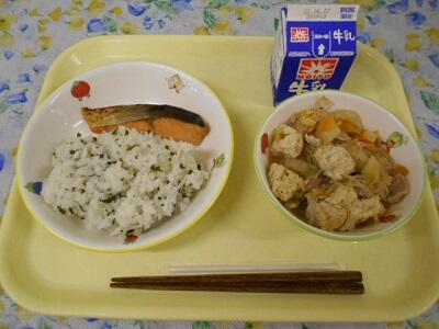ゆかりごはん、イカの磯焼き、かき玉汁、牛乳