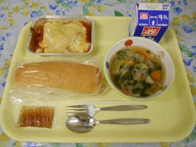ココア揚げパン、ミートオムレツ、洋風煮込み、牛乳