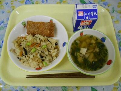 たけのこごはん、赤魚の塩焼き、沢煮椀、牛乳