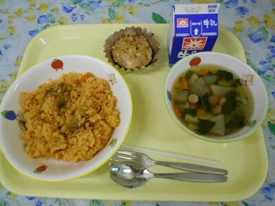 コーンピラフ、豆腐ハンバーグ、ABCスープ、牛乳