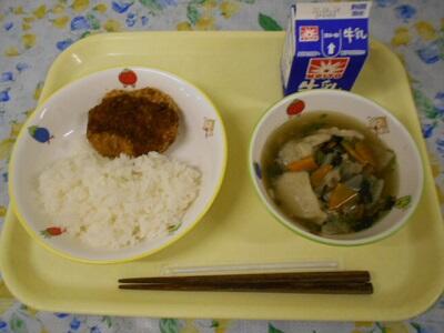 ごはん、メンチカツ、白玉汁、牛乳