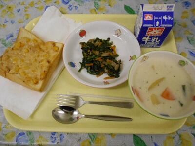 ツナコーントースト、ほうれん草のソテー、米粉のクリームシチュー、牛乳