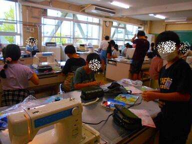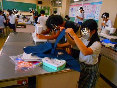 家庭科の時間には、ミシンの学習をしました。ミシンの仕組み、使い方を覚えたら、実際にミシンを使って「エプロンづくり」に挑戦です。