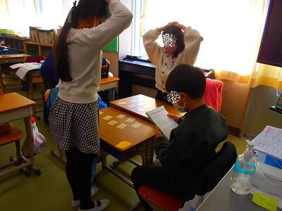 外国語活動では、理想の学校になるように教室配置などを英語のカードを使って考えました。