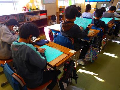 図工の時間には、彫刻刀を初めて使って版画に挑戦しています。