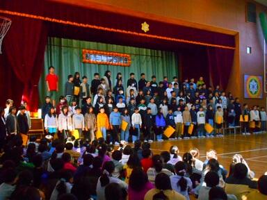 この後、1年生から5年生が分担して作ったプレゼントを1年生が代表して6年生に渡しました。