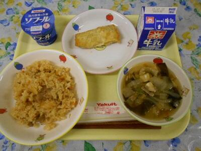 ひじきごはん、サバの味噌煮、白玉汁、牛乳