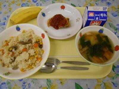 コーンピラフ、鶏肉のチリソースがけ、ABCスープ、バナナ、牛乳