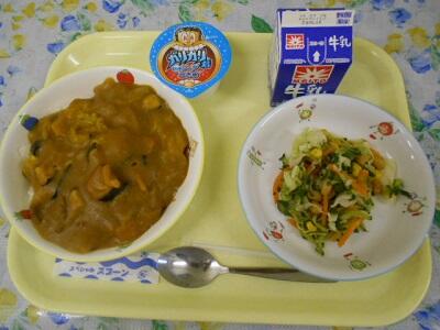 夏野菜カレー、豆サラダ、ガリガリくんソーダ、牛乳