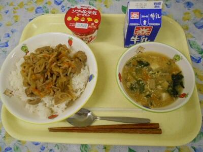 豚丼、かき玉汁、ヨーグルト、牛乳