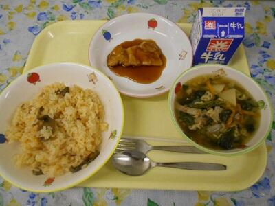 キャロットピラフ、ローストチキン、ABCスープ、牛乳
