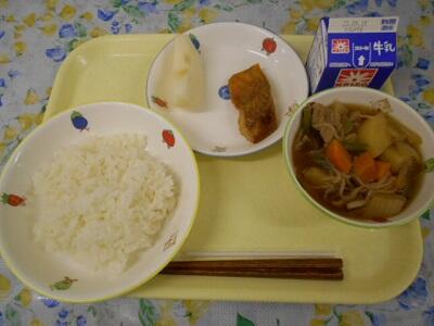 ごはん、赤魚の西京焼き、肉じゃが、あきづき(市川のなし)、牛乳