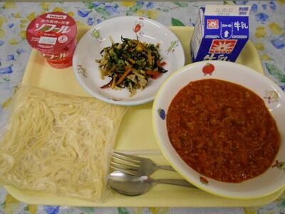 ミートスパゲティ、パリパリひじきサラダ、ヨーグルト、牛乳