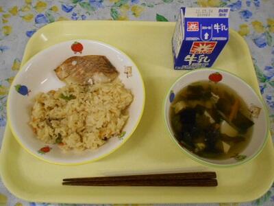 たけのこごはん、赤魚の塩焼き、沢煮椀、牛乳
