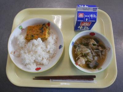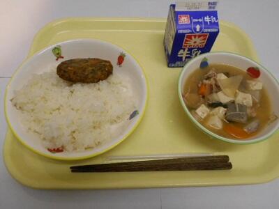 ごはん、手作りさつま揚げ、豚汁、牛乳