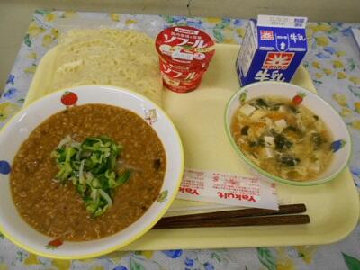 ジャージャー麺、中華スープ、ヨーグルト、牛乳