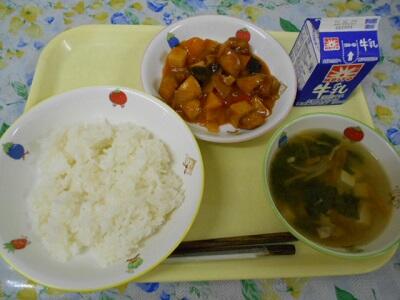 キャラメル揚げパン、ローストチキン、ABCスープ、牛乳